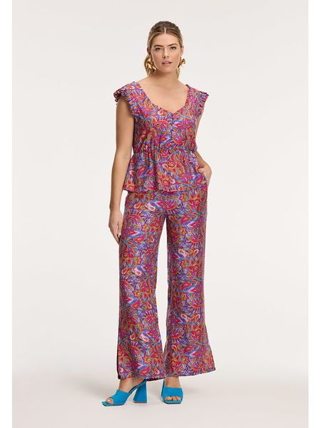 – wysokość pasa: high waist- pas / ściągacz: elastyczny- kieszenie: wpuszczane- zakończenia nogawek: rozcięcia- krój: prosty- wzór: na całości