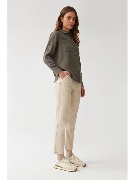 – wysokość pasa: regular waist- fason: regular fit- krój nogawek: prosty- szlufki na pasek: tak- zapięcie: guzik i suwak- kieszenie: wpuszczane i tylne- look: jednokolorowy