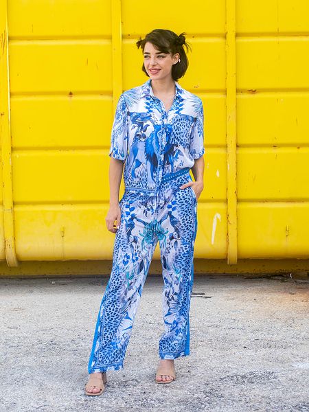 – czysta bawełna- pas / ściągacz: elastyczny- kieszenie: wpuszczane- zakończenia nogawek: dzwony- krój: prosty- wzór: na całości