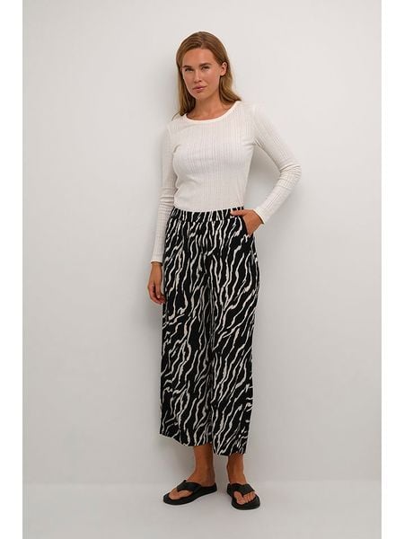 – czysta wiskoza- wysokość pasa: high waist- fason: loose fit- długość nogawek: 7/8- wzór: zebra