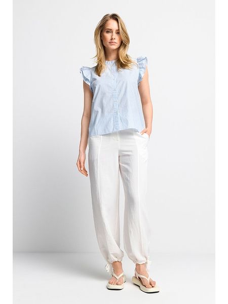 – z dodatkiem lnu- zapięcie: guzik i suwak- szlufki na pasek: tak- kieszenie: wpuszczane- zakończenia nogawek: ściągacz tunelowy i stoper- krój: luźny- look: jednokolorowy