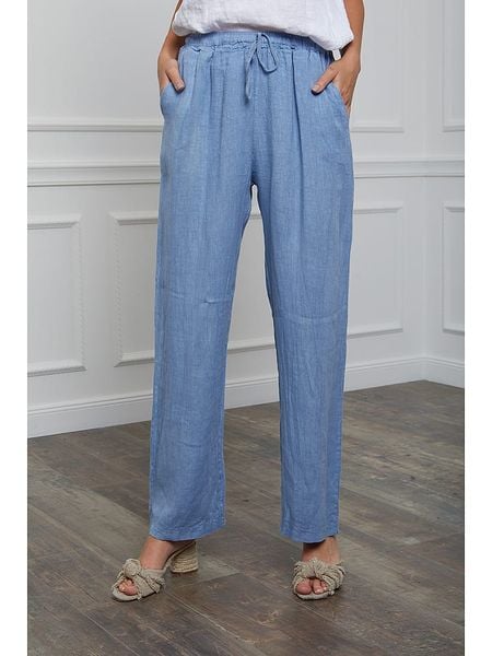 – czysty len- wysokość pasa: regular waist- zapięcie: ściągacz tunelowy- kieszenie: wpuszczane- krój: luźny- look: jednokolorowy