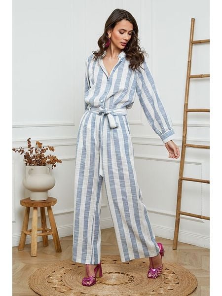 W zestawie:- 1 koszula- 1 spodnieKoszula:- kołnierz: stójka- zapięcie: listwa guzikowa- zakończenie rękawów: mankiet na guzik- krój: prosty- wzór: paskiSpodnie:- zapięcie: guzik i suwak- szlufki na pasek: tak- zdejmowany pasek: tkanina- kieszenie: wpuszczane- krój: prosty- wzór: paski