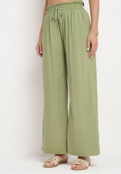 Zielone Spodnie Wiskozowe Palazzo z Wysokim Stanem i Gumką w Pasie Nasone