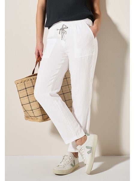 – czysty len- wysokość pasa: regular waist- pas / ściągacz: elastyczny- fason: comfort fit- look: jednokolorowy