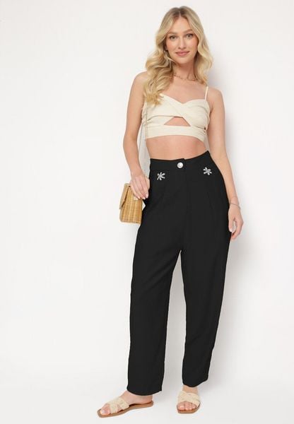 Czarne Spodnie Paper Bag z Wysokim Stanem i Cyrkoniami Uzilina