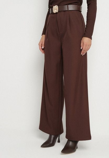 Brązowe Szerokie Spodnie Garniturowe z Paskiem ze Sprzączką Muszelką Salanva