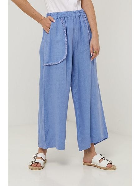 – czysty len- wysokość pasa: high waist- kieszenie: wpuszczane- długość nogawek: 7/8- krój: luźny- look: jednokolorowy