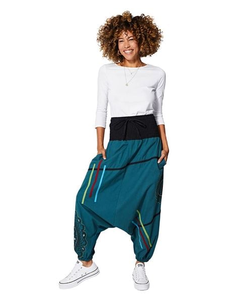 – czysta bawełna- pas: marszczony- niski krok- zakończenia nogawek: elastyczny ściągacz- krój: luźny- wzór: na całościWskazówka: Na metkach odzieży tej marki znajdują się rozmiary francuskie. Rozmiarówka została przez nas przeliczona. Podane do wyboru warianty rozmiarów odpowiadają standardowym europejskim rozmiarom konfekcji. Prosimy zapoznać się z zamieszczonym objaśnieniem rozmiarów:
