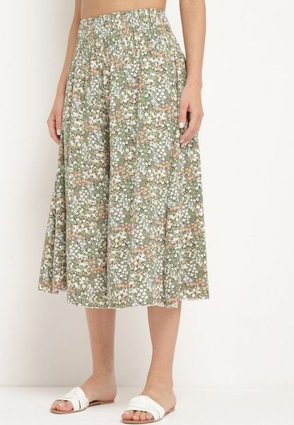Zielone Spodnie z Szerokimi Nogawkami Typu Kuloty z Wysokim Stanem i Gumką w Talii Vikiila