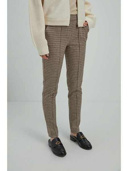– wysokość pasa: high waist- pas / ściągacz: elastyczny- kieszenie: wpuszczane i tylne- krój: wąski- wzór: kratka