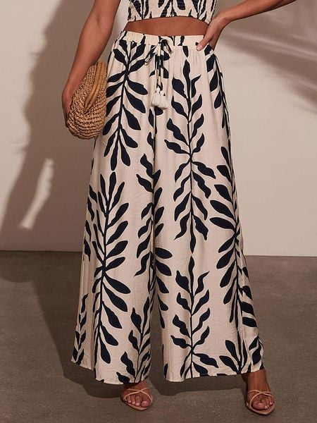 – czysta bawełna- wysokość pasa: high waist- pas / ściągacz: elastyczny- krój: prosty- krój nogawek: szeroki- detale: frędzle- wzór: na całościUwaga: Przy wyborze właściwego wariantu zaleca się korzystanie z tabeli rozmiarów.