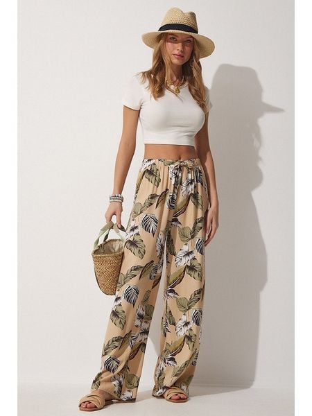 – czysta wiskoza- wysokość pasa: high waist- pas: ściągacz tunelowy- krój: luźny- wzór: kwiatowy
