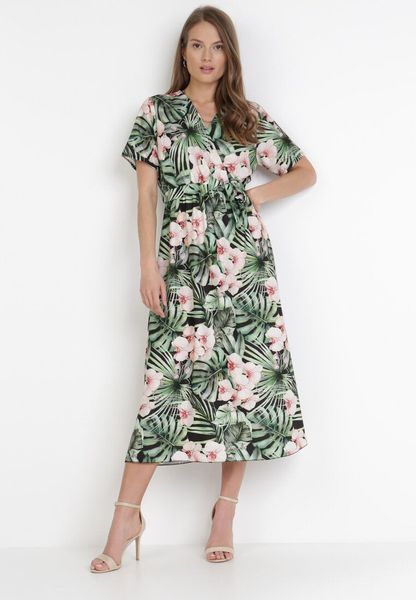 Sukienka Phrixephila w modny, roślinny wzór all over. Z elastyczną gumką w talii i materiałowym paskiem do kompletu. Kopertowa góra z głębokim, trójkątnym dekoltem. Krótki rękaw. Dół lekko rozkloszowany, długość midi. To modna letnia sukienka, którą wystylizujesz na wiele sposobów – pasuje do sandałów i balerinek.