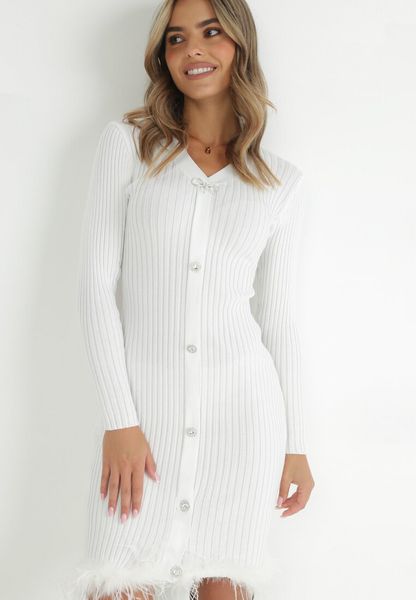 Biała Sukienka z Prążkowanej Dzianiny z Piórami Marpesia