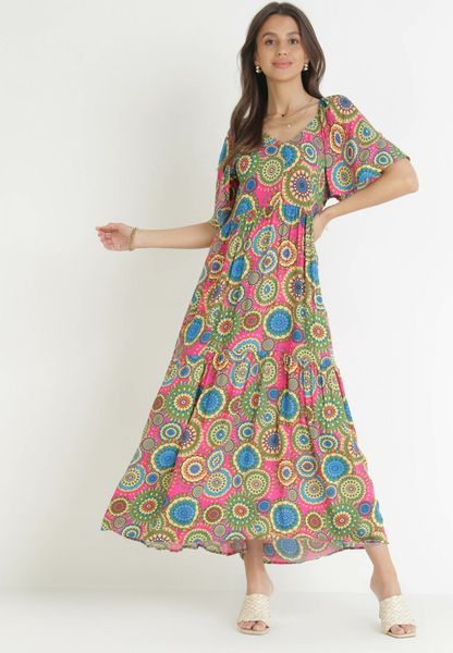 Fuksjowo-Zielona Rozkloszowana Sukienka Maxi z Falbanką z Wiskozy Sehna