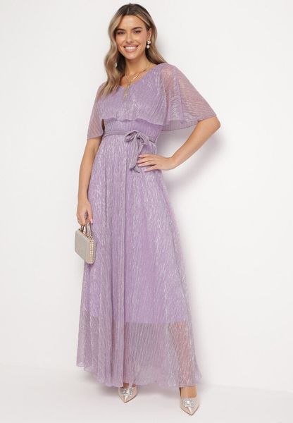 Fioletowa Plisowana Sukienka Maxi z Gumką w Pasie i Rozkloszowanym Dołem Tehe