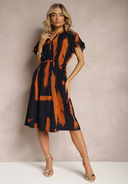 Granatowa Sukienka z Ornamentalnym Wzorem Sznurkami Przy Ramionach i Gumką w Talii Alerada