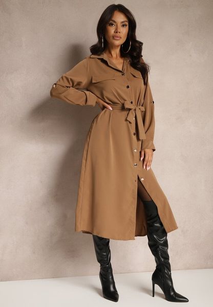 Brązowa Rozkloszowana Sukienka o Koszulowym Kroju z Guzikami Wiązana w Talii Kortiana