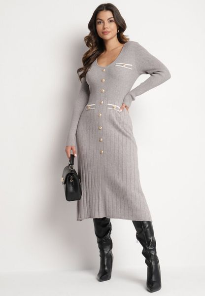 Szara Sweterkowa Sukienka z Wiskozą Ozdobiona Guzikami i Imitacją Kieszeni Izamines