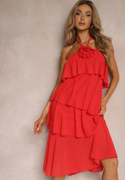 Czerwona Sukienka z Kwiatową Broszką Wykończona Falbanami i Wiązaniem na Szyi Tinashell