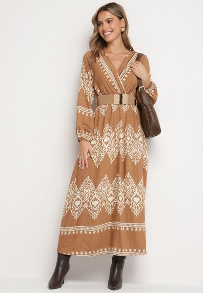 Beżowa Kopertowa Sukienka z Wiskozą z Paskiem i Gumką w Talii w Etniczny Wzór Zindoria