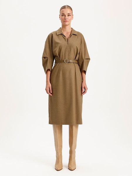 Jasnobrązowa Koszulowa Sukienka Zdobiona Haftowanym Wzorem Wiązana w Pasie Tinnora