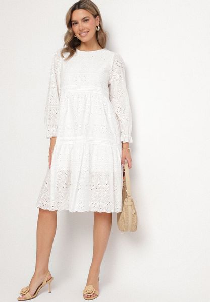 Biała Ażurowa Rozkloszowana Sukienka z Bawełny Edilavia