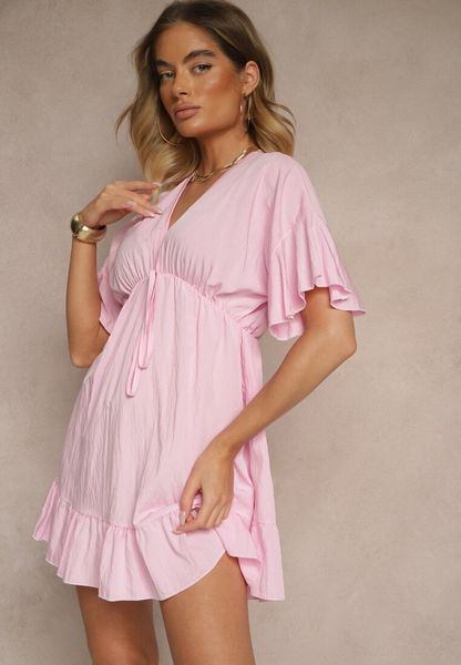 Różowa Rozkloszowana Sukienka z Wiskozą z Rękawami Typu Nietoperz i Falbanką Nellimi