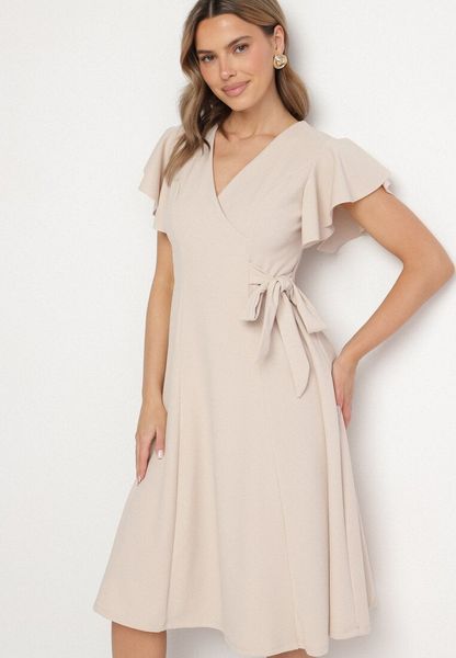 Beżowa Rozkloszowana Sukienka Kopertowa z Wiązaniem w Talii Dannila