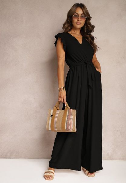 Czarny Koktajlowy Kombinezon Wiązany Paskiem Wykończony Falbankami przy Ramionach Vimaseni