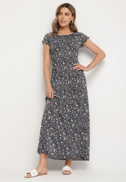 Granatowa Sukienka z Bufkami przy Rękawach w Kwiaty Neralese