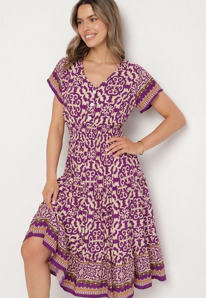 Ciemnofioletowa Bawełniana Sukienka z Guzikami i Ornamentnym Wzorem Zisselle
