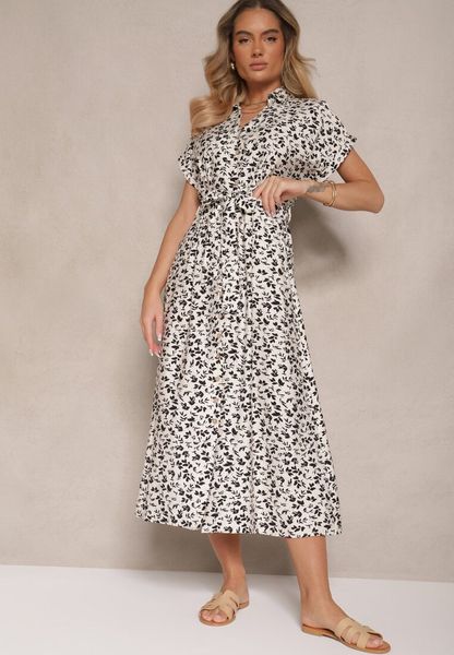Jasnobeżowa Koszulowa Sukienka z Bawełny w Kwiatowy Print z Wiązanym Paskiem Amoisse