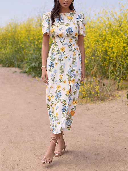 – dekolt: okrągły- zapięcie: guzik na plecach- krój rękawów: motylek – talia: marszczona- dolny brzeg: z rozcięciem- krój: taliowany- wzór: kwiatowy