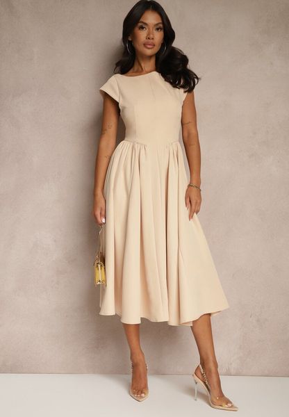 Beżowa Sukienka Vices o Rozkloszowanym Kroju z Dekoltem w Kształcie Łódki Milioria