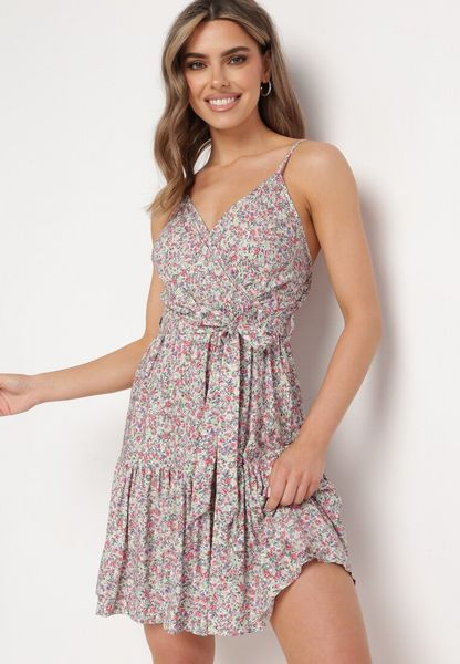 Biało-Różowa Kwiecista Sukienka z Wiskozy na Regulowanych Ramiączkach z Gumką w Talii Levalia