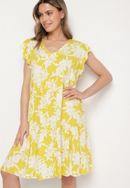 Żółta Bawełniana Sukienka w Kwiaty o Rozkloszowanym Kroju z Falbankami Norittia