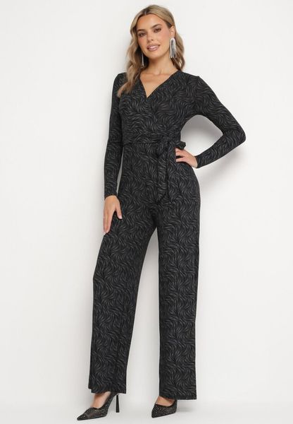 Czarno-Złoty Kopertowy Kombinezon z Wiskozą Zdobiony Wiązanym Paskiem Nalissa