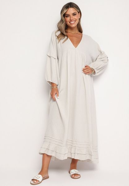 Beżowa Bawełniana Muślinowa Sukienka Ozdobiona Falbanką Perisea