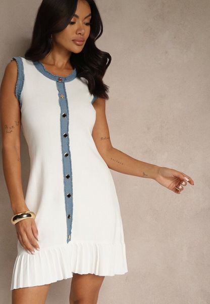 Biała Taliowana Sukienka z Dzianiny z Wiskozą z Ozdobnymi Guzikami i Falbanką Natinese