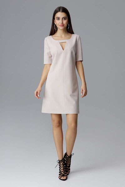 Beżowa Prosta Sukienka z Dekoracyjnym Wycięciem przy Dekolcie