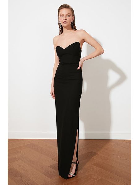 – dekolt: serce- dolny brzeg: z rozcięciem- krój: wąski- look: jednokolorowy