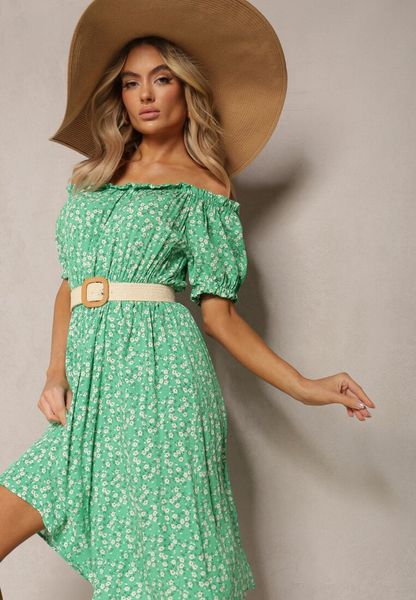 Zielona Sukienka Midi w Kwiaty z Hiszpańskim Dekoltem i Gumkami w Talii Clemitte