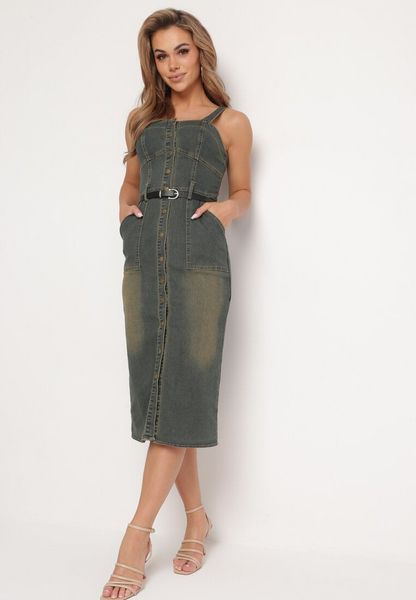 Granatowa Sukienka Jeansowa z Paskiem z Ekoskóry Zapinana na Napy na Ramiączkach Wezia
