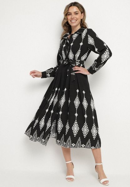 Czarna Wiskozowa Sukienka Koszulowa z Geometrycznym Wzorem i Paskiem Divorae