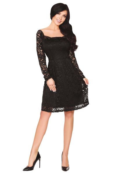 Czarna Rozkloszowana Sukienka z Koronki z Pięknym Dekoltem