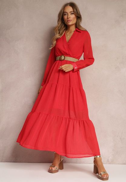 Czerwona Sukienka z Kopertowym Dekoltem i Plecionym Paskiem Velo