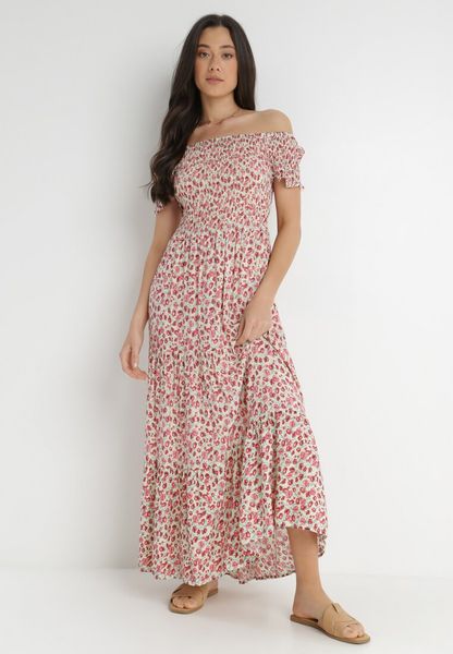 Sukienka Cheri z hiszpańskim dekoltem. Fason o długości maxi, rozkloszowany na dole, taliowany w pasie. Góra w całości przeszywana cienkimi gumeczkami, łącznie krótkim, lekko bufiastym rękawem. Na dole falbana. Brak podszewki. Udekorowana drobnym wzorem w kwiaty. Wykonana z wiskozy. Sukienka Hiszpanka Cheri to idealny wybór do letnich stylizacji z sandałami na obcasie.