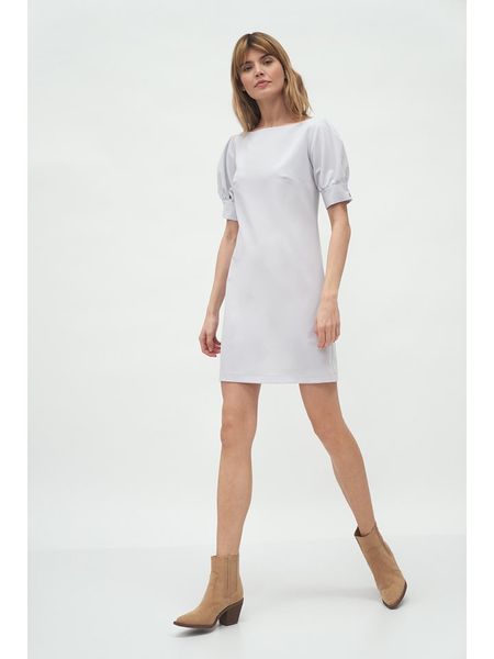 – dekolt: łódka- zapięcie: suwak na plecach- rękaw: bufiasty – długość rękawa: półdługi – zakończenie rękawów: mankiet na guzik – krój: prosty- look: jednokolorowy